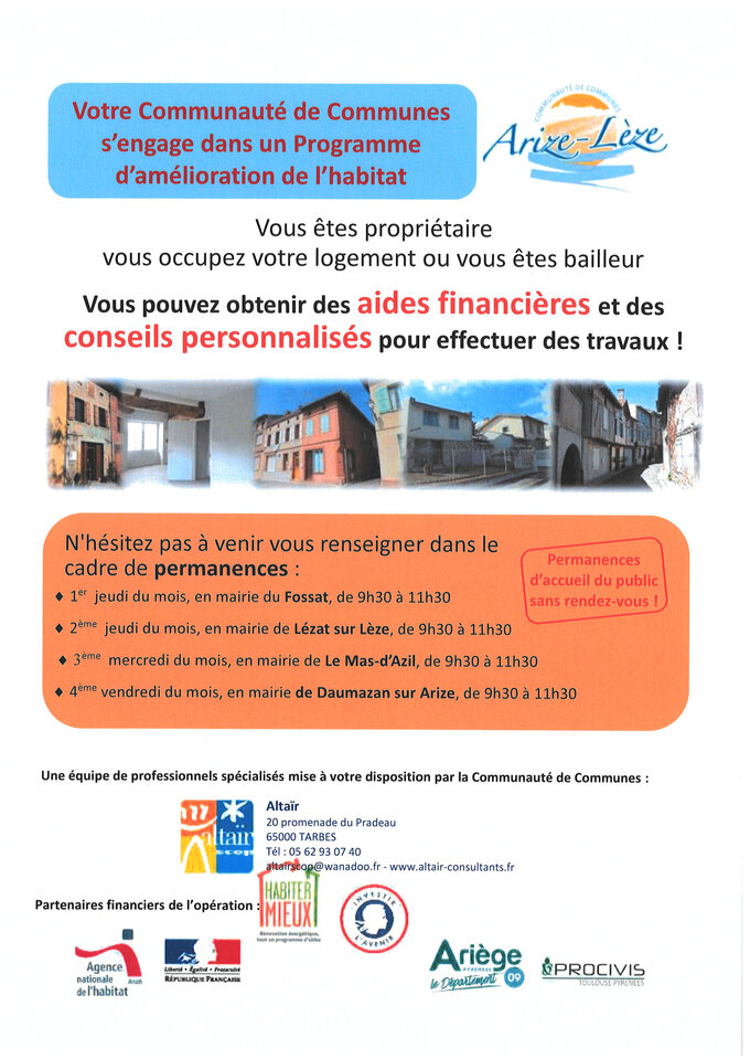 La Communauté de Communes, en partenariat avec l’ANAH (Agence Nationale de l’Habitat), l’Etat, le Conseil Départemental de l’Ariège et le Conseil Régional (PROCIVIS), s’engage pour au moins 3 années, dans un Programme d’Intérêt Général (P.I.G.) consacré à l’amélioration de l’habitat.